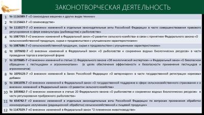 В этом плане я должен отметить несколько вопросов. В производстве ВБР, как и по другим отраслям, на отрезке 90-х годов мы падали. И к 2000 году добывали всего 3 млн. тонн. Но затем отрасль пошла вверх, в чем есть заслуга и тех законодательных решений, которые мы приняли на направлениях исторического принципа, квот под киль, переработки, береговой инфраструктуры, поставки на берег рыбы, обновления флота. Кроме того, у нас в разработке сейчас находятся законодательные инициативы и по прибрежному рыболовству, и по аквакультуре, где также есть движение вперёд и за последние пять лет нам удалось на 60% увеличить это производство.