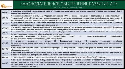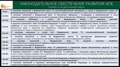 Это 31 законодательный акт, в том числе Закон «О зерне», «О племенном животноводстве», «О плодородии почв», «О пчеловодстве» и многие другие. Это все базовые законы, над обеспечением эффективной правоприменительной практики которых мы работаем вместе с Министерством сельского хозяйства.