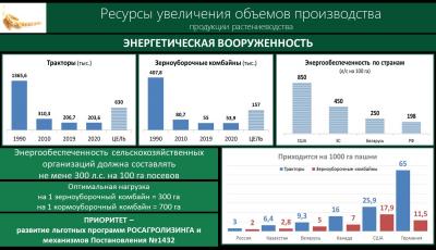 Сегодня благодаря эффективным механизмам обновления парка сельскохозяйственной техники нам удалось затормозить падение на этом направлении. Сейчас мы на отметке в 204 тысячи тракторов и 54 тысячи комбайнов при общей энерговооруженности в 198 л.с. на 100 га. А ведь всего 30 лет назад на 100 га наши мощности в сельском хозяйстве составляли больше 300 лошадиных сил. Теперь же в Белоруссии в 2,5 раза больше комбайнов, чем у нас, и в 3 раза больше тракторов. А если взять Соединённые Штаты Америки, то мы увидим восьмикратный разрыв. Германия вообще за пределами каких-либо сравнений.