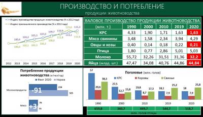 На первой таблице вы видели производство кормов, которое у нас сократилось в четыре раза к уровню 1990 года. Это еще один индикатор, ведь каждый организм животного – это фабрика по переработке этих кормов. Поэтому и производство зерна, как сырья, которое гонится сегодня без добавленной стоимости за рубеж, это не та модель движения вперед, которая нам нужна.