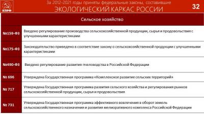 Мы сейчас пробили вторую Целину. Двадцать шестого мая подписал Мишустин. С 1,2 триллиона, который мы предложили, тоже я докладывал, Медведеву, докладывал Путину. На совете законодателя, но конце концов, снизив, но она пошла, она в жизнь пошла. И уже не от этого к этому же первые 13 миллионов мы должны вот к 2025 году ввести дополнительно 80 миллионам, которые есть, у нас, как вы помните, в 1990 году было 117 миллионов. Мы под это еще приняли 35 законов, где мы являемся авторами этих законов, начиная от плодородия почвы, заканчивая агролесомелиорацией. Государственное регулирование внесения агрохимикатов, пестицидов и так далее. Закон о зерне, о племенном животноводстве, о страховании и др. Значит и целый блок лесных и о недропользовании законов, обеспечив экологический каркас. Если бы дать им волю дальше так работать, то у нас уже 27 территорий подвержены опустыниванию.