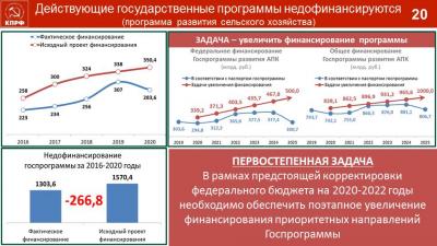 Вот в сельском хозяйстве. Мы авторами являемся программы развития сельских территорий. Я проводил доклад, делал в большом зале пленарном по этой теме на слушаниях. Еще Ткачев был, делал содоклад, было много губернаторов. Два госсовета подтвердили эту программу на 2,2 триллиона. Но в первый же год Минфин, правительство сократили исходное начало этой программы. Программа работает, и мы все сделаем, чтобы вернуться к исходным данным и двигаться. В этом году только по этой по прямой 40 миллиардов идет на эту программу. Что это имеется ввиду: это в деревне жилье, это дороги, это газификация, это рабочие места, это инфраструктура., ФАПы и др.