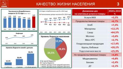 Качество жизни давайте разберем в цифрах. С 2014 года по нынешний год доходы снизились до 89%, значит на 11% снизились доходы. Цены до 37% это, не считая 2021 год, взметнулись. Если посмотреть все, что связано с нищетой, то можно увидеть, что ниже черты бедности 12,9%, 28,% - у черты бедности, 34% - ниже средней зарплаты. Это тоже близко к этому. Остается совсем небольшая процентная доля, которая прихватила очень много: под 60% всех доходов.