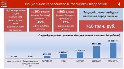 На следующем слайде это социальное неравенство мы еще раз хотим показать. 30 миллионов зарплата в месяц у многих «орлов» и членов правления. Оказывается, отдельные личности могут получать миллионы, а средняя пенсия у вас в округе 14,9 тысяч рублей. Даже на оборонном вот этом мощном предприятии, имеющем сегодня перспективу. Без которого ничего не взлетает и не стреляет сегодня, зарплата средняя ниже по экономике. Мы сегодня об этом с Дмитрием Борисовичем Фалиным говорили. Он сказал, что в этом году постараемся на пятьдесят одну тысячу тоже выйти по средней зарплате на предприятии.
