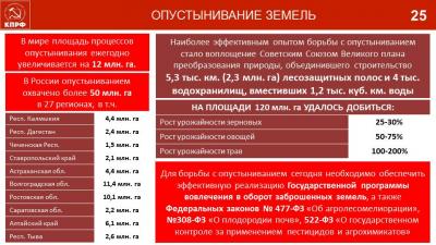 Опустынивание земель. Воды нет, значит, плодородие почв отсутствует, движение песков нарастает. На 27 территориях. Сталинский план преобразования природы. 5,3 тысяч километров посадили наши отцы и деды вот этих прекрасных посадок. Четыре тысячи только водоемов. А эта власть все бросила. Вот сейчас мы закон тоже, я автор, приняли. Об агро лесомелиорации, хотя бы устанавливаем ответственность, есть в этом плане движения. Я думаю, результат должен быть, но это должны, опять, всем миром решать и коммунисты здесь должны быть застрельщиками. Устранение этих всех безобразий.