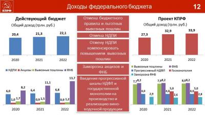Мы тоже здесь прописали, я говорил, деоффшоризация дает нам только по большому счету 5 триллионов. Прогрессивный налог, монополия на спиртоводочный. При царе было 20%, при советской власти не меньшее 15-17 % в бюджет формировалась за счет этого. Сегодня - копейки. Все по карманам и людей травят. И другие вопросы, которые связаны в первую очередь с национализацией. То есть вот тема, которая прописана - снижение налогового времени на экономику работает с пошлинами вывозными. Делая их соответствующими, можно, в том числе, налог убрать и НДПИ. В целом никаких проблем нет, исходя из того, что часть мы средств, убирая бюджетные правила, значит, запускаем на этот бюджет развития. И тогда мы предлагаем следующую схему.