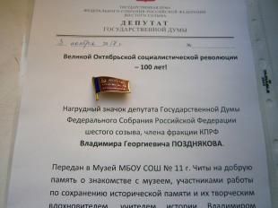 В канун 100-летнего юбилея Великой Октябрьской социалистической революции депутат Государственной Думы В.Г. Поздняков подарил школьному музею нагрудный депутатский значок – символ фракции КПРФ в Государственной Думе РФ.