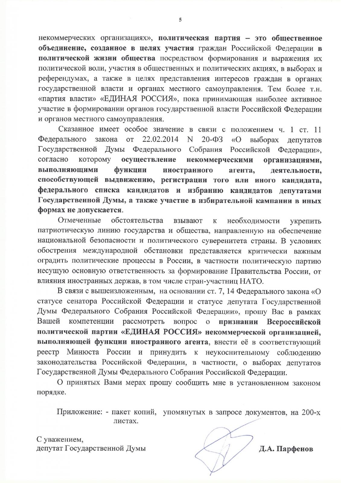 Депутат Государственной Думы от КПРФ Денис Парфенов направил в Министерство юстиции, а также в Центризбирком, депутатский запрос о признании партии «Единая Россия» организацией, выполняющей функции иностранного агента.