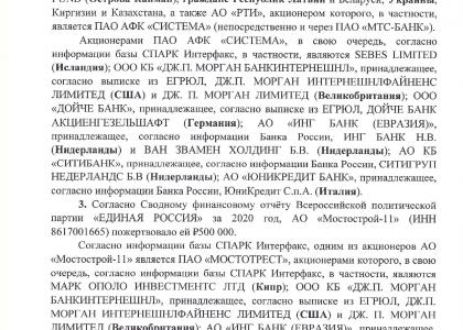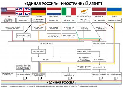 Вместе с тем, финансовый отчёт «Единой России», опубликованный на сайте Центральной избирательной комиссии, свидетельствует о том, что так называемая «правящая партия» получает финансирование от организаций с иностранным финансовым участием. К числу иностранных держав, в которых базируются компании - держатели долей российских фирм, помогающих материально «Единой России», относятся, в частности, США, Великобритания, Германия, Италия, Нидерланды, Каймановы Острова, Кипр, Украина, - т.е. в том числе откровенно враждебно настроенные к России страны, в том числе участницы НАТО.