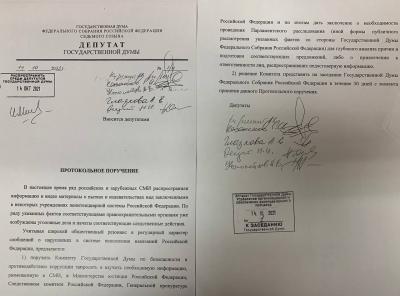 Протокольное поручение внесли депутаты фракции КПРФ. О видеозаписях пыток рассказал депутат А.Куринный. Он предложил, «учитывая широкий резонанс и регулярный характер сообщений о подобных нарушениях», поручить комитету ГД по безопасности и противодействию коррупции направить запросы информации в Минюст, СК и Генпрокуратуру. По итогам решить вопрос о парламентском расследовании.