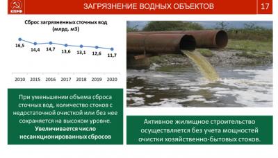 При уменьшении объема сброса сточных вод, количество стоков с недостаточной очисткой или без нее сохраняется на высоком уровне – более 11 млрд. м3. При этом увеличивается число несанкционированных сбросов.