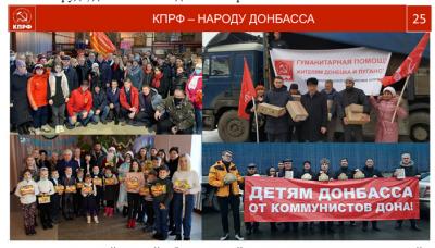 Особое место, характеризующее протестную деятельность партии, занимает девяносто один продовольственный конвой и 13000тонн ценного груза, отправленных в поддержку жителей Донбасса и других горячих точек и десятки гуманитарных конвоев в Московской области в помощь ветеранам войны и труда, детям войны и домам ветеранов.