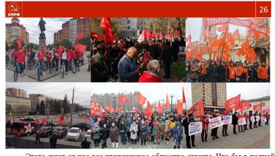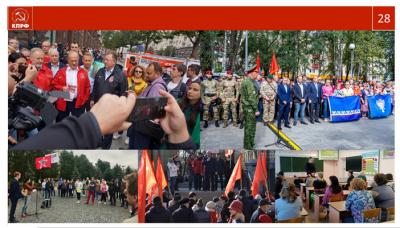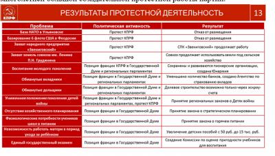 Впереди новые задачи и еще более напряженная работа. Разбудить гражданскую активность общества может лишь "левый" поворот в государственной политике и национальный бюджет развития. Кадровый протестный ресурс партии растет и развивается. КПРФ и ее протестный штаб сегодня координируют работу более полусотни организаций левого народно-патриотического движения. Нас давно объединили общие проблемы и боль за судьбу страны и ее народа. Партия бережно сохраняет в исторической памяти и сознании гражданского общества боевые и трудовые традиции советского народа, выдающиеся экономические и социальные завоевания общества социализма. Подвиг советского народа сделал нашу страну сплоченной, сильной и независимой, построил социализм, добился Великой Победы в кровопролитных войнах с гитлеровским фашизмом и японским милитаризмом. Это наши отцы и деды, в небывало сжатые сроки, осуществили промышленную индустриализацию и научно - технический прорыв в образовании, науке и технологии. Знаменательные события и даты партия делает темами своих протестных акций, напоминая молодежи о великой истории своей страны. Даже в условиях капиталистического гнета и эксплуатации, в народе продолжает жить память поколений о великом советском периоде. В массовом общественном сознании сформированы устойчивая потребность исторической правды и требование левых перемен, социалистического возрождения, осуществления государственной политики национальных интересов. Эту потребность не сможет приглушить даже тотальная лживая пропаганда многочисленных проправительственных СМИ.