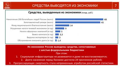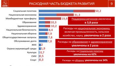 Почти 130 триллионов рублей, которые могли бы решить накопившиеся проблемы, плодотворно работать на российскую экономику и благосостояние наших граждан, обеспечить восстановление социальной инфраструктуры, сегодня выведены за рубеж. А это почти шесть сегодняшних государственных бюджетов России. Вернуть эти средства в бюджет, сделав его полноценным, достаточным для прорывного развития нашей Родины, трудная работа, требующая системного подхода и железной политической воли. Суть наших устремлений и, предлагаемых обществу Программ, вы хорошо знаете. В центре их содержания всегда стоит человек. Именно через интересы человека мы смотрим на систему социально-экономического развития нашего общества, когда предлагаем объединяющий лозунг «За Сильную, Справедливую, Социалистическую Родину!». Безусловно, к победе мы идем в единстве с прогрессивными силами левого движения и поддержкой народа. КПРФ к борьбе за формирование бюджета РАЗВИТИЯ России готова.