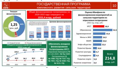 Наши программы другие. Они возрождают деревню, они дают развитие крестьянству, наконец, они скрепляют территории в единое многофункциональное государственное пространство. В этом случае находит разрешение целый комплекс назревших разновеликих проблем, которые сегодня для страны представляют серьезную опасность. И это не только по селу или по органическому питанию, по качественному питанию, или с/х производству.