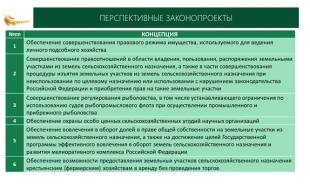 - подготовка к началу реализации Государственной программы эффективного вовлечения в оборот земель сельскохозяйственного назначения и развития мелиоративного комплекса Российской Федерации и повышение эффективности использования земель сельскохозяйственного назначения;