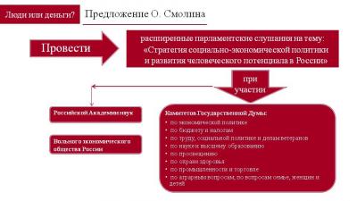 Предлагаю провести расширенные парламентские слушания на тему: «Стратегия социально-экономической политики и развития человеческого потенциала в России» с участием академии наук и Вольного экономического общества по поводу стратегии экономической и социальной политики и развития нашего человеческого потенциала на среднесрочную перспективу.