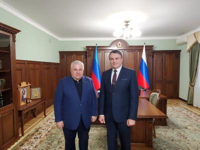 Далее Казбек Тайсаев провёл встречу с главой ДНР Денисом Пушилиным. В начале беседы были переданы слова приветствия от лидера КПРФ и СКП-КПСС Геннадия Андреевича Зюганова. В ходе дискуссии обсудили нынешнюю ситуацию в Республике, перспективы экономического, научного и культурного развития ДНР и возможную помощь со стороны Российской Федерации, в частности, Коммунистической партии.