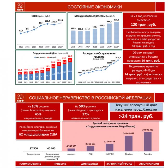 Более тридцати лет в России правит компрадорско-олигархический капитализм. Он заматерел на вседозволенности, укрепился материально и организационно, расставив свои кадры во властных структурах. Но теперь внутренние проблемы - нищета и бедность, разобщенность общества, кризис управления экономикой и кредитно-денежной политикой, дополняются внешними угрозами: санкциями и глобальным ростом международной напряженности, вплоть до угрозы прямых военных столкновений. Как результат, огромные средства запущены в гонку вооружений, но резко сокращено бюджетное финансирование важнейших стратегических и социальных программ развития. Запущен очередной инфляционный виток цен и тарифов, что, безусловно, повлечет за собой дальнейшее обесценивание рубля и еще более глубокое обнищание народа. За пять последних лет в стране закрыто более 1,6 млн. предприятий, вместе с которыми ликвидированы и рабочие места. По прогнозу рост российского ВВП в ближайшие годы будет неуклонно из года в год снижаться. В текущем году на развитие национальной экономики выделяется лишь 2,6% ВВП. Сползая в технологическую яму, страна продолжает терять научные кадры. Их отток из России за последние 9 лет ускорился в 5 раз.