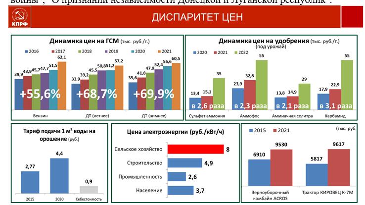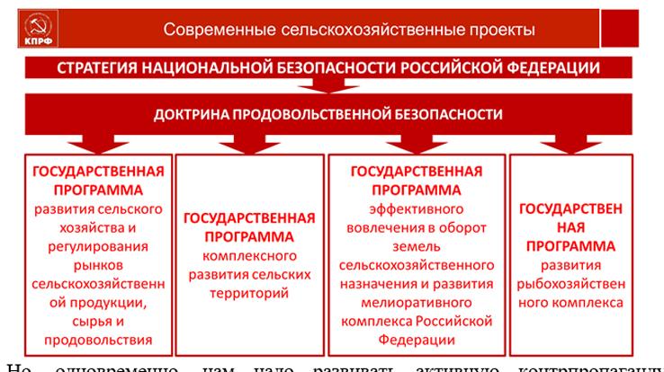 Мы продолжим бороться против капиталистического гнета, передачи земли, лесных, рыбных запасов и с/х угодий в частные руки, засилья семейственности во власти, варварской пенсионной реформы и нищенского уровня жизни народа. Недавно, на базе Тимирязевской академии, мы провели соответствующие слушания по кадровому потенциалу АПК. Вся Россия была на связи. В своем докладе тогда мы показали грандиозность и эффективность проектов, осуществленных советской властью по освоению казахстанской целины и нечерноземной зоны, внедрению широкой комплексной мелиорации. Все это особенно разительно оценивается на фоне ущербной политики сегодняшнего правительства, его равнодушию к реализации важнейших и не менее значимых, государственных программ по "Комплексному развитию сельских территорий", "Второй целины". Власть водрузила на этом пути завалы бюрократических проблем, выразившиеся в кратном сокращении проектного финансирования, неоправданном вздутии цен на минеральные удобрения, технику, ГСМ.