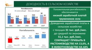Напомню, что по советским временам рентабельность считалась не как в промышленности. У нас если ниже 30%, то расширенного воспроизводства вести не получится, при условии сохранении достойной заработной платы работникам, хотя бы не ниже средней по экономике. А что сегодня? Если вывести зарплату в сельском хозяйстве на средний уровень, то рентабельность на всех направлениях рушится!
