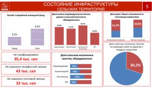 В России централизованным отоплением оборудовано лишь 67%, сельских населенных пунктов, горячим водоснабжением – 33%, водопроводом – 37%, водоотведением – 45%. Половина новых индивидуальных жилых домов не подключены к коммуникациям.