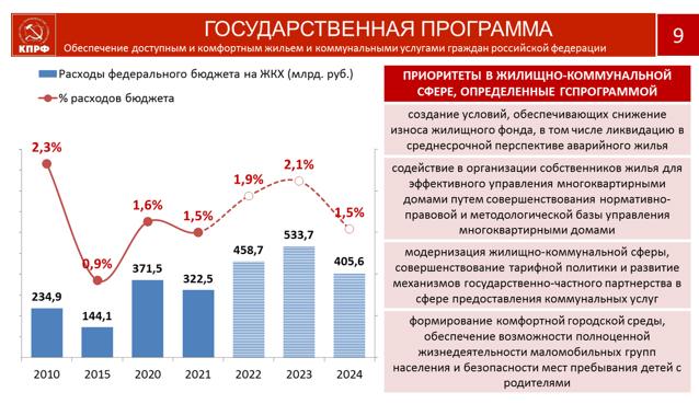 Жилищно-коммунальное хозяйство – является одной из ключевых систем жизнеобеспечения населения Российской Федерации, определяет качество жизни каждого без исключения человека. Строительство и содержание жилья, водоснабжение и водоотведение, тепловая и электроэнергия плотно связывают ЖКХ с основными отраслями народного хозяйства Российской Федерации. При этом нельзя упускать экологическую составляющую, обеспечения благоприятной окружающей среды в населенных пунктах через управление отходами, регулирование выбросов и сбросов. Именно поэтому Коммунистическая партия Российской Федерации рассматривает вопрос развития ЖКХ, как один из важнейших и требующий системной государственной политики. Мы об этом говорили с самого начала реформы ЖКХ, но воз и ныне там. К чему это привело, сегодня отчетливо может видеть каждый.