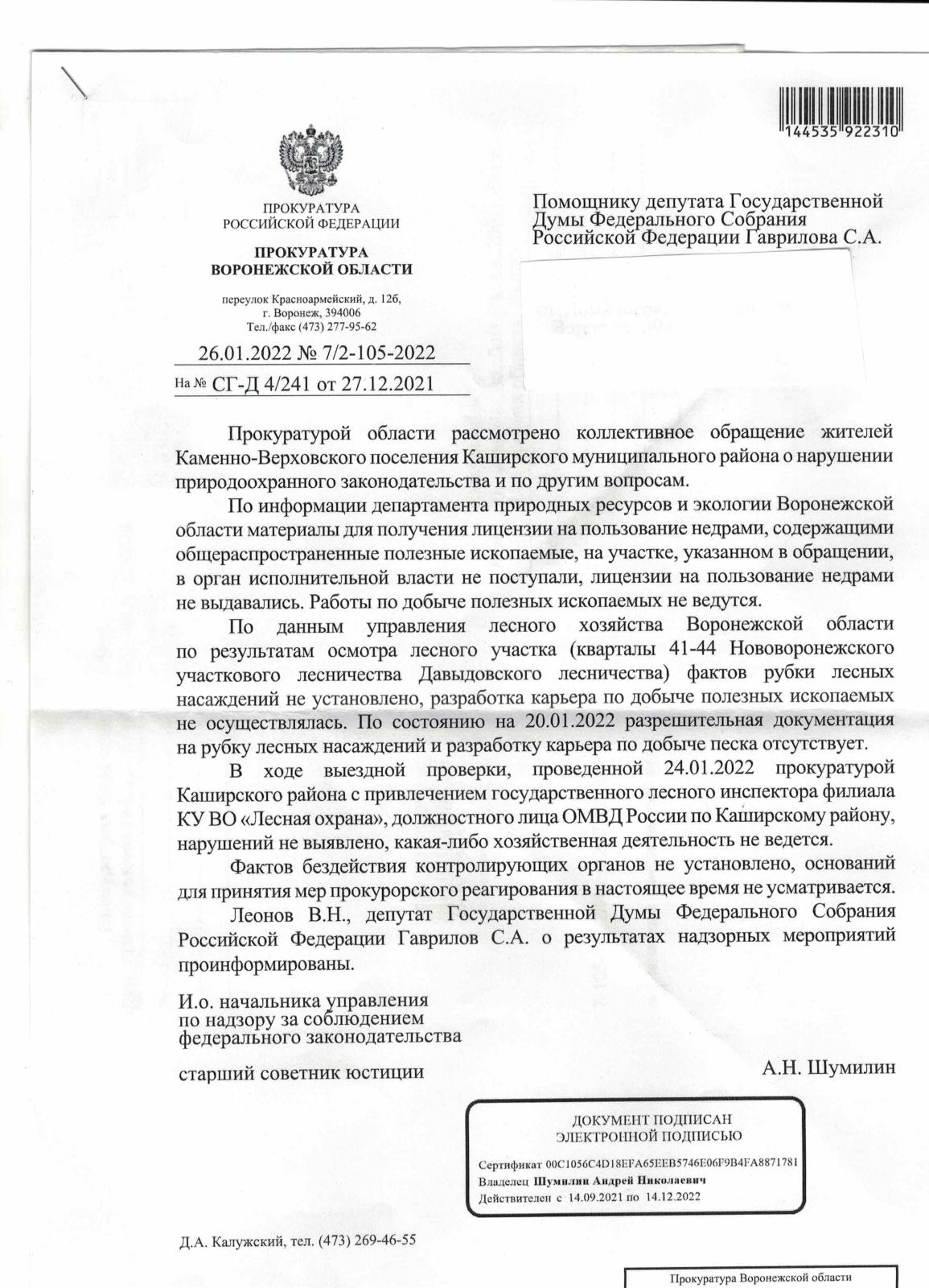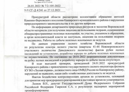 Прокуратура Воронежской области заверила каменноверховцев и депутата, что «в настоящее время работы по добыче полезных ископаемых не ведутся. По состоянию на 20.01.2022 г. разрешительная документация на рубку лесных насаждений и разработку карьера по добыче песка отсутствует».
