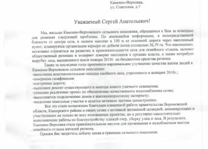 «По имеющейся информации, в лесном массиве, в 100 метрах от основной дороги через населенный пункт, планируется организация карьера по добыче песка площадью 36, 79 га», - написали жители села в обращении. Добыча песка неизбежно повлечёт за собой вырубку леса, высаженного на этом месте за бюджетные средства региона после пожара 2010 года, опасаются селяне. А вырубка лесных насаждений, в свою очередь, отрицательно скажется на всей экосистеме села и района.