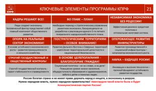 Я ещё раз желаю всем удачи. Надеюсь, что этот материал вам поможет. Правильно С.Г.Левченко здесь говорил, что идеи, положения наших программ надо приблизить к регионам, к каждой территории, к городу и селу, что бы каждого сделать своим сподвижником. Теперь вы вооружены самым серьёзным аргументированным, системным материалом для того, что производительно работать, что бы эти 20 шагов нашей программы, донести до любой аудитории, сделать понятными и поддерживаемыми народом.