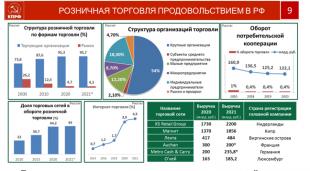 Делается это для раздувания монополии крупных сетей, которым конкуренты не нужны. Вот они, сети, на слайде, пожалуйста - по два с лишним триллиона оборот и Магнит, и Пятёрочка, и так далее.