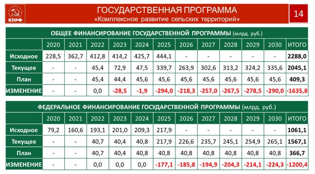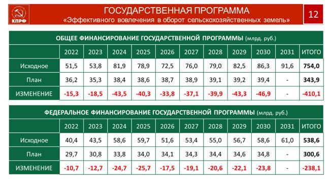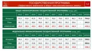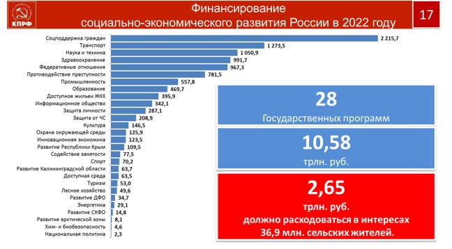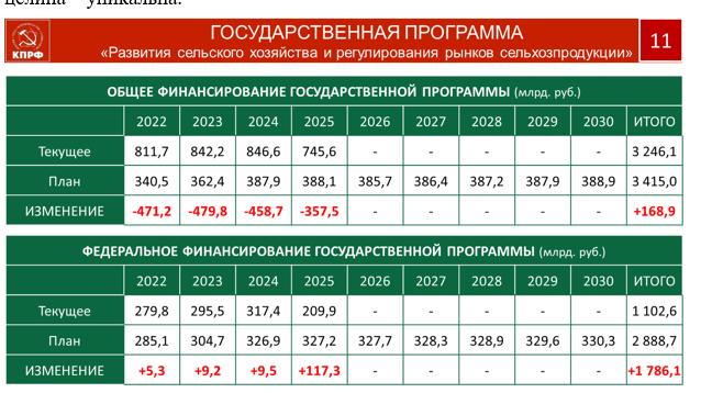 Уважаемые товарищи, на селе сегодня живет 37 миллионов человек. Именно село создает продовольственную безопасность государства. Все параметры его развития в ближайшей перспективе, поддерживающие и сохраняющие эту важнейшую отрасль в жизнеспособном состоянии, заключены в 28 государственных программ, на реализацию которых требуется 2,6 триллиона руб. Но, учитывая объективную реальность, мы допускаем меньший объем выделяемых средств. Но даже их нам пытаются обрезать.