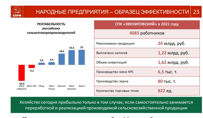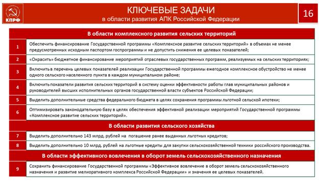Но при решении этой задачи, на нашем пути опять встали либеральные провокаторы из пятой и шестой колонн, которые за спиной Президента и Премьер-Министра обрезают финансирование и блокируют процессы. Мы не можем этого допустить. Вместе с аграрным бизнесом и широким патриотическим движением мы добьемся решения этой проблемы. Идет сложная, многоплановая борьба, в которой победа будет достигнута. Партия не позволит долго твориться этому безобразию. К этому предопределяют и происходящие сегодня политические события.