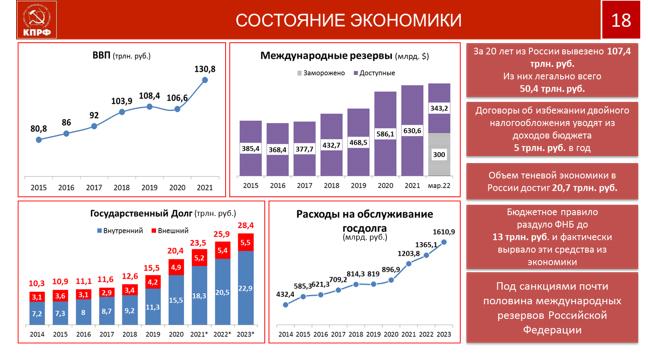Состояние экономики можно видеть на следующем слайде. В том числе сколько средств вывезено из страны, как идет нарастание государственного долга и так далее.