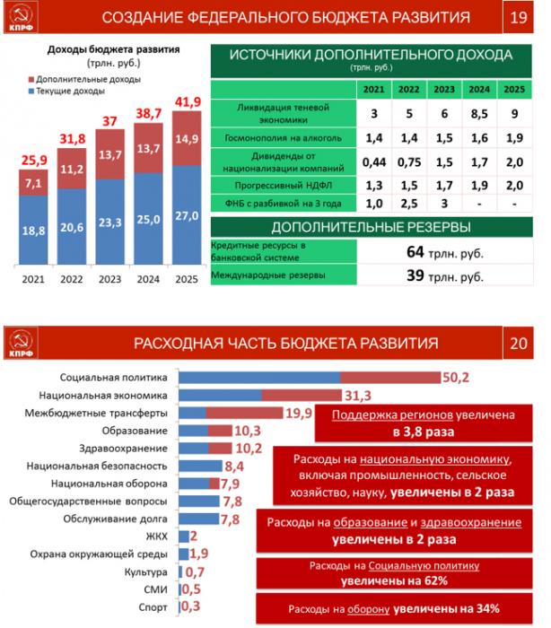 Уважаемые товарищи, в заключение хочу вновь показать, разработанный нами, альтернативный правительственному, проект федерального бюджета развития. Все статьи его наполнения и целевого распределения тщательно изучены, взвешены и просчитаны. Он объективен и наиболее целесообразен для страны, для восстановления кризисной экономики, для развития производительных сил.