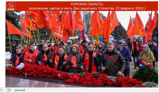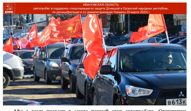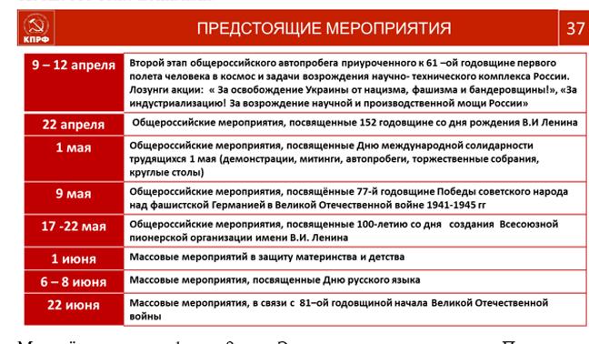 Впереди, 12 апреля, у нас новая большая Всероссийская акция в поддержку нашей Армии, которая проводит уникальную операцию, борется с фашистами, бандеровцами и всякой нечистью, представляющей русофобскую мафию, антикоммунистический, антисоветский режим власти. Нашу Армию мы с вами будем поддерживать всеми силами. Внимательно смотрите у себя в регионе, что бы не оставить без внимания и поддержки семьи воинов. Коммунисты всегда были первыми в борьбе с фашистской нечистью. Мы должны продолжить их дело. Были и в нашем составе некоторые заблуждающиеся товарищи. Но все это в прошлом.