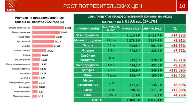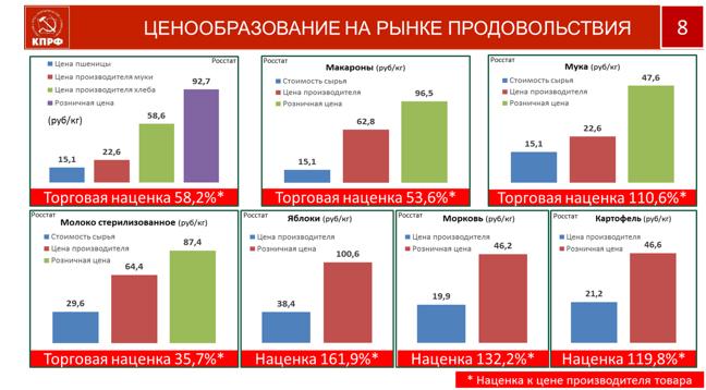 Сейчас особо актуален продовольственный рынок товаров. Мы недавно проводили слушания в Государственной Думе. Вот посмотрите динамику формирования розничной цены буханки хлеба: 15 рублей – цена зерна, сделал муку - уже 22 руб., выпек хлеб – 58 рублей, а продают хлеб уже по 98 руб. Крестьянин год горбатится, получив за килограмм зерна 15 рублей, из этого килограмма делается два с половиной батона. Торговля продаёт его по 98. И это цена килограмма простого белого хлеба, который покупает каждая семья. А так же макароны и всё другое. Мы сейчас внесли проект Закона о государственном регулировании и контроле цен на продовольствие и товары первой необходимости. Были недавно со своими предложениями у премьера. И Президент сказал, борьба с нищетой - главное для любой государственной структуры, для каждого руководителя.. В первую очередь это должно стать заботой государственного аппарата, чиновников всех уровней. Поскольку в вопросе потребительских цен в большой степени просматривается коррупция. Вот сейчас накрутили по сахару: по 53 рубля продают сахар в опте, а по 100руб уже продают в рознице. Ну что это такое? Вот сейчас чуть поприжали - легко снизили до 67. Идет чистейшей воды противозаконная накрутка. А если взять овощи. Картофель, вы посмотрите, 132р., 119р.,160р.. Наценки торговые накручиваются в 2,5 – 3 раза. Наш партийный актив также должен за этим следить. Очень правильно наши товарищи выступали, это прямая обязанность депутатов всех уровней – смотреть все эти цепочки, убирать из ценовой цепочки всяких прилипал и стяжателей.