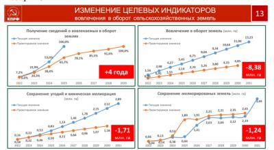 Невозможно разрывать задачу увеличения производства мяса, зерна, молока от необходимости вовлечения в севооборот дополнительных площадей, включая ранее брошенные 37 миллионов гектаров пашни. Это так же наша с вами важнейшая задача на сегодня. Нельзя допустить, что бы эти благодатные почвы захватили под стройку корыстные, жестокие рейдеры.