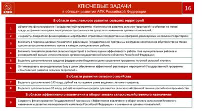 Развитие села является стратегической задачей, обеспечивающей жизнь четверти населения страны и создающей продовольственную безопасность государства. Реализация нашей программы позволит создать на селе полноценную социальную инфраструктуру и производственную базу с рабочими местами. Необходимо всем включаться в эту работу. Важно, что бы каждый из вас также у себя внимательно смотрели как решается эта проблема..