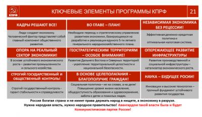 Основываясь на содержании принятых Законов, весь актив, все партийные организации самым серьёзным образом продолжали работать над реализацией нашей Программы, которая предельно актуальна и конструктивна. Ее основой служит глубокий реальный анализ, а целью, поставленной партией, являются смена курса и кардинальные перемены в государственной политике. Положения Программы КПРФ предусматривают разоблачение и устранение правил укоренившейся коррупционной системы, посредством которых либеральная бюрократия, укоренившаяся во власти, имела возможность каждый раз воздвигать непроходимые заборы на пути реализации основных положений наших Программ. Многие из вас на местах преуспели, в этом плане. Примеры, когда наши партийные организации, грамотно работая, убирали из власти и сажали в тюрьмы зарвавшихся губернаторов и мэров-мздоимцев, всевозможных других чиновников-проходимцев, ранее мы не раз приводили.