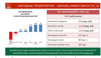 Я хотел бы ещё раз всех вас поблагодарить за активную работу и пожелать плодотворной деятельности по выполнению стоящих задач. Экономика, развитие социальной сферы, о которых мы много говорим, невозможны без партийно-политической работы нашей партии. Обществу и продвижению патриотических начинаний необходимы опора на советские традиции.