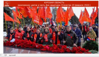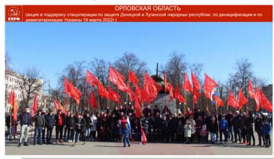 Впереди, 12 апреля, у нас новая большая Всероссийская акция в поддержку нашей Армии, которая проводит уникальную операцию, борется с фашистами, бандеровцами и всякой нечистью, представляющей русофобскую мафию, антикоммунистический, антисоветский режим власти. Нашу Армию мы с вами будем поддерживать всеми силами. Внимательно смотрите у себя в регионе, что бы не оставить без внимания и поддержки семьи воинов. Коммунисты всегда были первыми в борьбе с фашистской нечистью. Мы должны продолжить их дело. Были и в нашем составе некоторые заблуждающиеся товарищи. Но все это в прошлом.