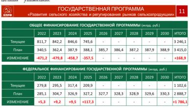Уважаемые товарищи, на селе сегодня живет 37 миллионов человек. Именно село создает продовольственную безопасность государства. Все параметры его развития в ближайшей перспективе, поддерживающие и сохраняющие эту важнейшую отрасль в жизнеспособном состоянии, заключены в 28 государственных программ, на реализацию которых требуется 2,6 триллиона руб. Но, учитывая объективную реальность, мы допускаем меньший объем выделяемых средств. Но даже их нам пытаются обрезать.