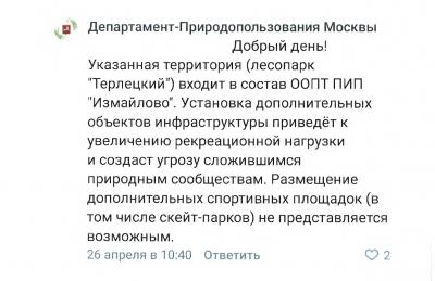 В принципе, против скейтпарков мы ничего не имеем (хотя, наверное, в Москве в таком количестве строить их всё-таки странно, скейтеров в столице не так много), но в любом случае для их строительства лучше подыскать место более подходящее, чем ООПТ. Да, Терлецкий лесопарк входит в состав ООПТ ПИП «Измайлово», и очень странно, что чиновники из префектуры ВАО, педалирующие идею этого проекта, не учли этого обстоятельства.