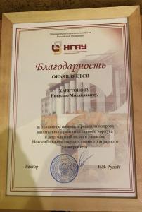 В ходе мероприятия ректор Новосибирского ГАУ Евгений Владимирович Рудой вручил Николаю Михайловичу Харитонову Благодарность за оказанную помощь в решении вопроса капитального ремонта главного корпуса и многолетний вклад в развитие Новосибирского государственного аграрного университета.