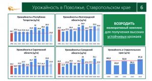 Мы провели анализ главных житниц по Поволжью. Вот в Татарстане, посмотрите, урожайность 1990 года и прошлогодняя. И так каждые 2-3 года выскакивает. Когда хорошая влажность, тогда и урожайность за 30 центнеров. Это все коррелируется и в Саратовской, и в Волгоградской, и в Самарской областях. И у вас эта взаимосвязь выражена, конечно, менее жестко, но все равно это - то 34-37, то 22-26.