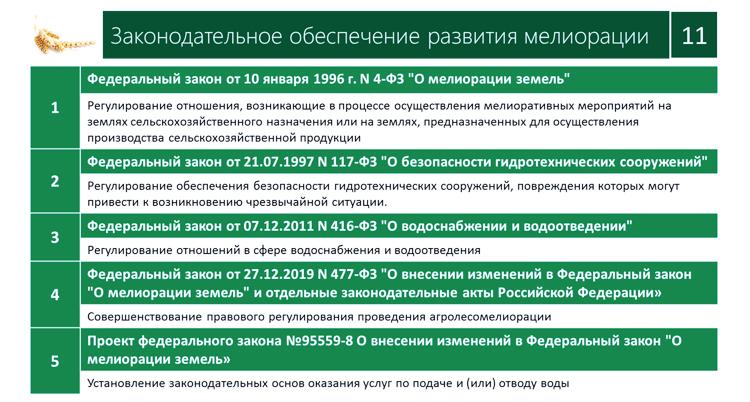 Есть закон «О безопасности гидротехнических сооружений», «О водоснабжении и водоотведении», собственно профильный закон «О мелиорации», к которому мы на последнем заседании Комитета рассматривали проект поправок в части договоров подачи/отведения воды. Есть и другие проекты, над которыми нам только предстоит начать работать.