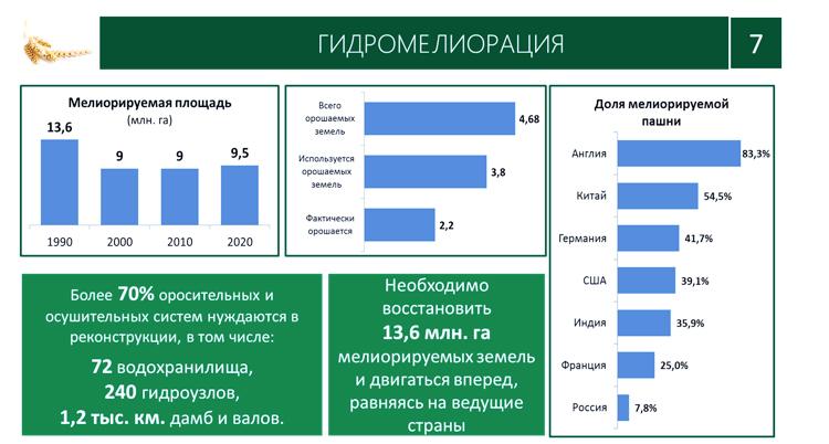 Для сравнения, в Америке в 1990 году были те же 13,6 млн. га мелиорируемых земель. Но к сегодняшнему дню они ушли далеко вперед, под 40 процентов от площади пашни. Китай уже 54% пашни мелиорирует и вместе с Индией по 2 миллиона гектаров в год вводят мелиорируемых земель. Мы же с вами провалились к уровню семи-восьми процентов. Поэтому для нас масштабы задачи понятные.