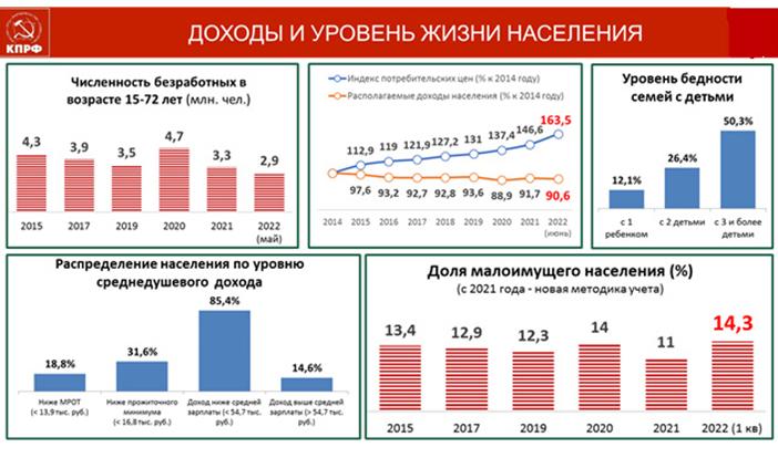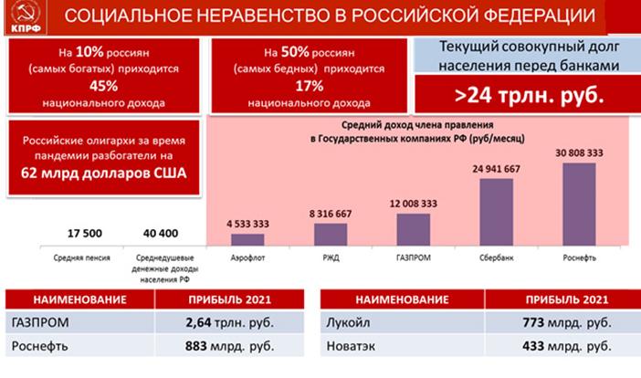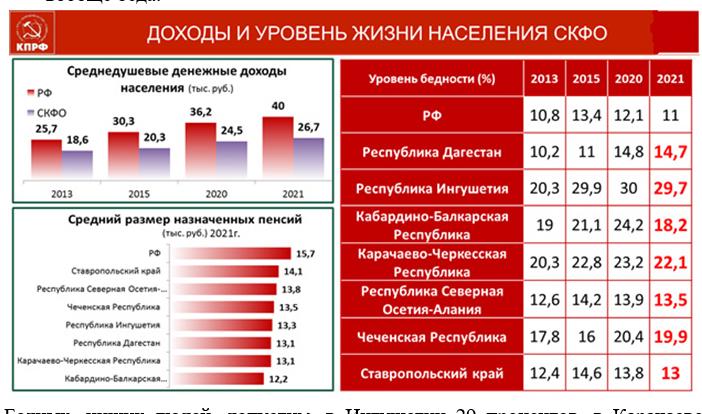 Бедных, нищих людей, допустим, в Ингушетии 29 процентов, в Карачаево-Черкессии – 22 процента, около 20 в Чеченской республике и так далее. За тридцатилетнее доминирование во власти чиновничьей олигархии и клана либеральных демократов, социальные слои российского общества оказались разобщены и радикально поляризованы. Это свидетельствует о полном провале политики олигархического капитализма. За жаждой собственного обогащения они забыли о проблемах людей-тружеников, ветеранах, молодых семьях, выпускниках учебных заведений.