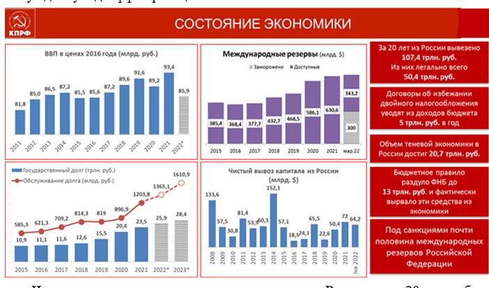 Уважаемые товарищи, для восстановления и развития кризисной экономики тем более необходим полновесный и сбалансированный по статьям расходов бюджет государства. Посмотрите на состояние экономики и какую высокую цену страна заплатит, спасая зарубежные активы олигархов, за вынужденную деоффшоризацию.